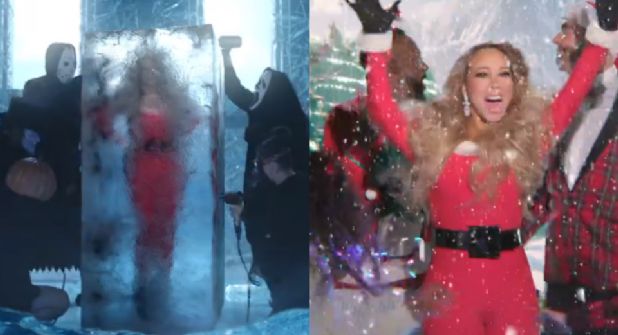 Cuando finalmente logran romper el hielo, Mariah es liberada y comienza la celebración por Navidad, acompañada por su emblemática canción, bailarines, nieve ficticia y cajas de regalo de diferentes tamaños.