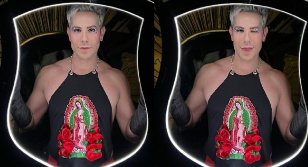 En las imágenes se observa a Chávez sonriente y portando el top, el cual es de color negro, sujetado del cuello con una cadena dorada y con la imagen de la Virgen de Guadalupe y flores rojas al centro.