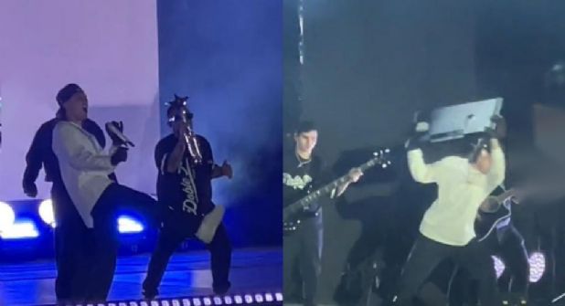 Ecuador.- El cantante Peso Pluma se viralizó en redes sociales por patear y arrojar una pantalla de televisión durante un concierto en Ecuador.