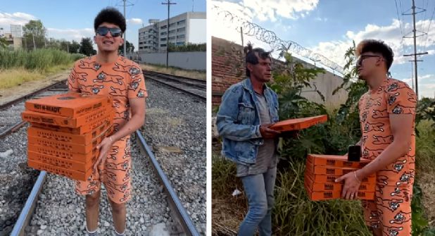 En la grabación se observa el momento en que reparte cajas de pizza a las personas que se encuentran en la zona.
