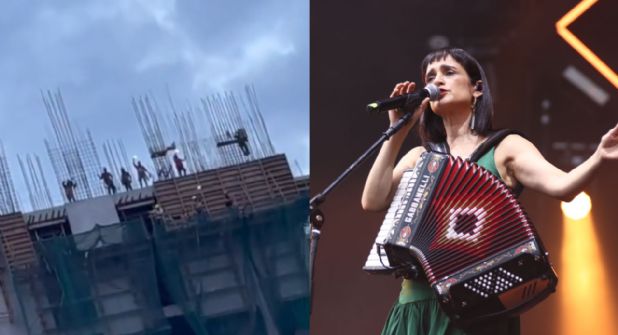 Monterrey.- ¡Disfrutan dese las alturas! Para estos albañiles no fue necesario acudir al festival del Pa’l Norte en el Parque Fundidora, pues en lo alto de un edifico en construcción pudieron apreciar del gran espectáculo de Julieta Venegas.