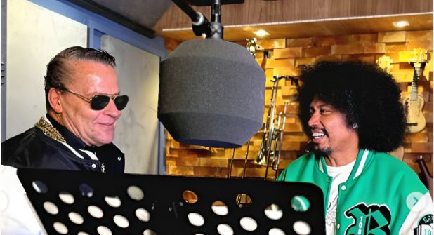 En sus redes sociales el conductor y actor apareció luciendo lentes oscuros y una chamarra tipo universitario estadounidense, junto al rapero mexicano "El Negro más guapo" con quien va a colaborar para una canción.