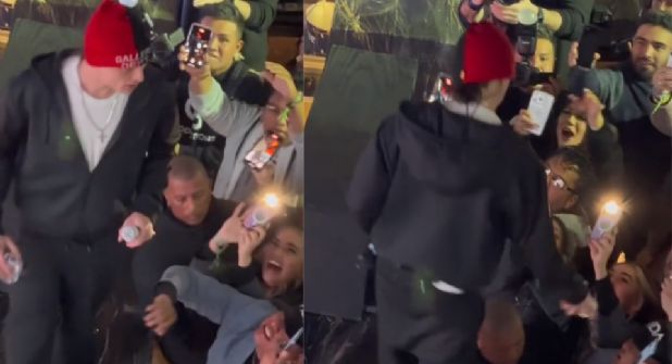 Mientras Peso Pluma seguía caminando pateó un vaso un vaso desechable y, posteriormente, se detuvo al frente de uno de sus fans, quien vestía camisa celeste y portaba una gorra en color negro. Al estar frente a él, de la nada, Peso Pluma optó por vaciar el agua de la botella que llevaba consigo sobre el fanático.