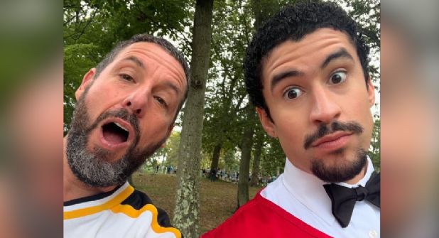 Por su parte, Adam Sandler aparece con un jersey de hockey correspondiente a los Boston Bruins, un pantalón holgado y sus botas marca Timberland.