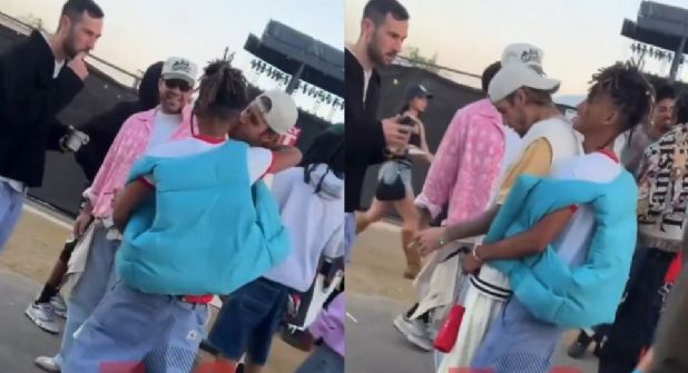 Posterior, el joven actor abraza por detrás a Bieber, quien le da un tierno beso en la mejilla al hijo de Will Smith. Finalmente, el rapero estadounidense saluda a los demás presentes y se une a la charla.