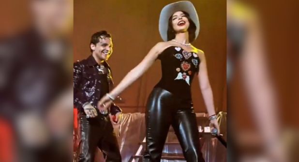 Monterrey.- Ante rumores de un romance, Christian Nodal subió al escenario de su segundo show en Monterrey a la cantante Ángela Aguilar para interpretar el tema 'Dime cómo quieres'.