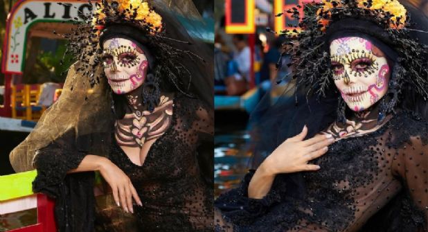El maquillaje, inspirado en las tradicionales catrinas, destacó por su precisión y colorido, evocando la elegancia de esta figura icónica mexicana.