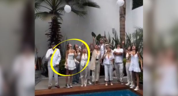 Glabert aparece con un grupo de personas en la orilla de una alberca al interior de una residencia, mientras todos soltaban globos en medio de un festejo aparentemente familiar.