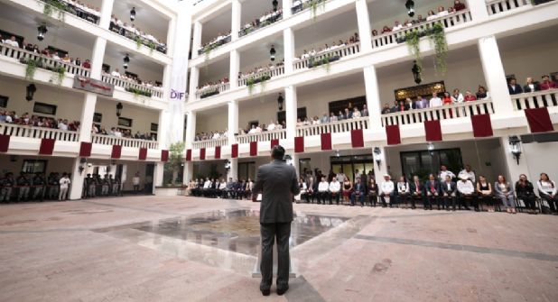 La ceremonia, llevada a cabo en la explanada central del Palacio, también marcó la develación de los escudos de los 43 municipios, celebrando la identidad y el patrimonio cultural de la entidad.