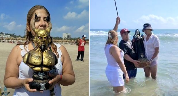 Una mujer llamada Lizeth Alvarado, que se identifica como bruja negra, publicó en sus redes sociales fotos en donde se aprecia la presencia de las estatuillas de estas deidades sobre la arena, muy cerca del mar.