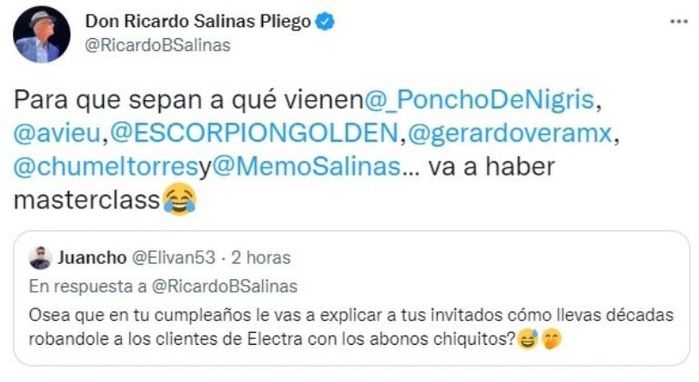 Ciudad de México. – El empresario mexicano Ricardo Salinas Pliego, realizará la noche de este lunes su tan comentada cena de cumpleaños desde las instalaciones de TV Azteca, y hoy mismo destapó un par más de personas que lo acompañarán en la velada.