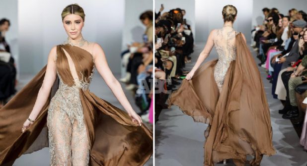 Priscy Escoto lució en la pasarela de París, Francia, un jumpsuit color ocre como drapeado en seda y transparencias en top, según la marca regiomontana, la cual dio a conocer los detalles del espectacular atuendo de la creadora de contenido de moda.