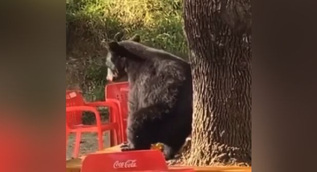 Ahora, otro oso fue visto muy cerca del lugar donde los alumnos suelen degustar sus alimentos, pero no fue captado buscando sobras, sino rascándose contra el tronco de un árbol.