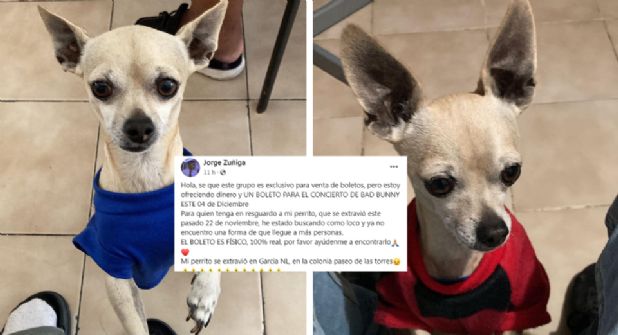 García.- Un usuario en las redes sociales pide ayuda de la ciudadanía para localizar a su perrito, como recompensa ofrece dinero y un boleto para el concierto de Bad Bunny, a celebrarse el próximo 4 de diciembre.