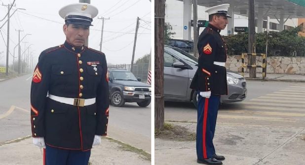 Con ese uniforme en color negro, característico de los marinos, el individuo se paró en el crucero de las calles Reynosa y 15 de septiembre, punto que visita cada 14 de febrero.