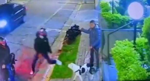En ese mismo momento, los individuos se detienen frente al hombre, y el que iba en la parte trasera de la motocicleta desciende con la intención de asaltarlo.