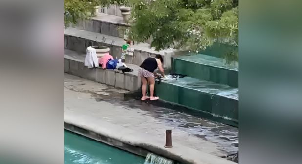 Monterrey. – Una mujer fue captada lavando ropa sucia en el Paseo Santa Lucía, en el centro de Monterrey.
