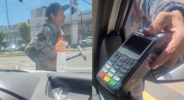 Ambos se quedaron con la mano extendida cuando el limpiaparabrisas exhibió su terminal, ofreciendo la posibilidad de pago a aquellos que no contaban con monedas o efectivo y con tarjetas de crédito o débito únicamente.