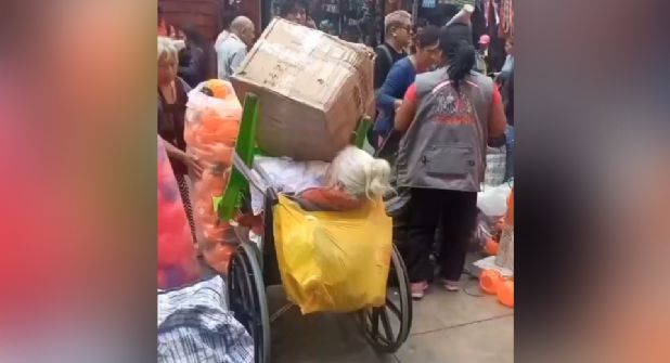 A pesar de que el video no dice mucho, se puede apreciar cómo la silla de ruedas donde se encuentra la mujer es usada para cargar cosas, sin importar que ella esté ahí sentada.