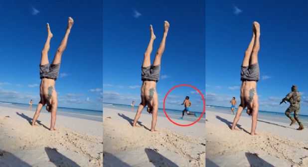 El material captado por Jayson lo muestra a él, de cabeza, realizando su sesión de yoga en la playa, mientras detrás de él aparece un individuo semidesnudo, siendo perseguido por un militar.