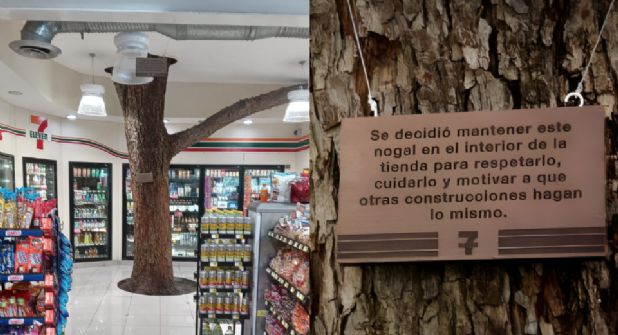 El árbol, cercano a la zona de los refrigeradores, cuenta con una placa que dice el siguiente texto: “Se decidió mantener este nogal en el interior de la tienda para respetarlo, cuidarlo y motivar a que otras construcciones hagan lo mismo”.