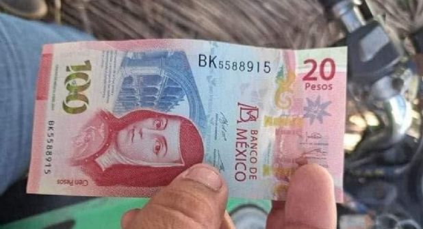 Ciudad del Carmen. – Como se tratase de un fallo en la matriz, un usuario en redes sociales afirmó haber recibido de un cajero un billete inédito, que resultó ser una mezcla entre valores de 100 y 20 pesos.