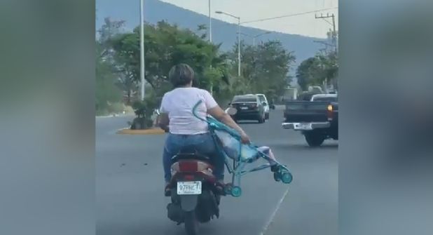 Un automovilista que recorría las calles de Sahuayo de Morelos captó con su celular el recorrido hecho por un motociclista, quien viajaba con una mujer que, a su vez, cargaba una carriola con un menor en su interior.
