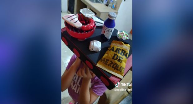 En el video explica que diseñó una bolsita de carbón y hasta le puso trocitos reales. También colocó en el sombrero un botecito con agua oxigenada para simular una bebida alcohólica.