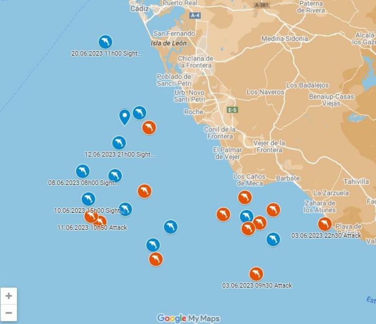 En lo que va del mes de junio han sido detectados 22 avistamientos y 12 ataques de orcas en esta zona, lo anterior expuesto en el portal orcas.pt. creado por un joven llamado Rui Alves.