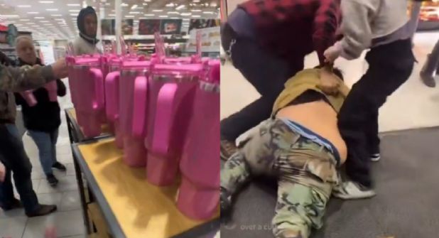 En otro video compartido en plataformas digitales, se muestra a dos hombres en una pelea por un par de termos color rosa en Estados Unidos.