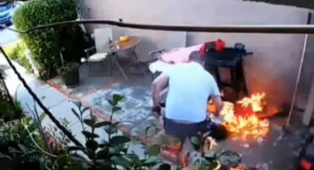 Al intentar sofocar las llamas, el hombre patea el recipiente de plástico, golpeando la mesa y haciendo que caiga el asador y el carbón en llamas, incendiando todo lo que lo rodea.