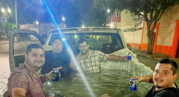 En el video se aprecian a varios jóvenes disfrutar de su “alberca móvil”, mientras pasean por calles del municipio de General Terán y mitigan las altas temperaturas.