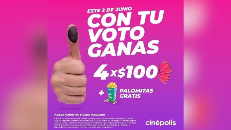 Ciudad de México. – La cadena Cinépolis anunció una promoción vinculada a las próximas elecciones, que le permitirá a los amantes del cine comprar cuatro boletos por 100 pesos y recibir unas palomitas gratis.