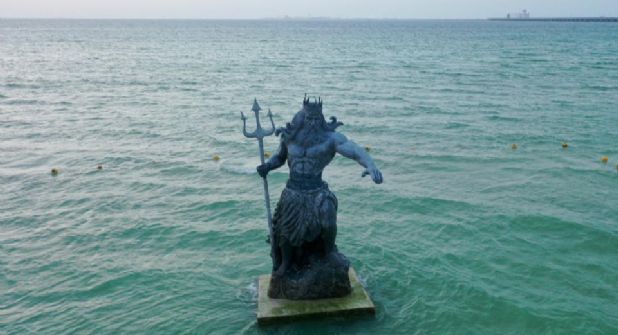 Los yucatecos señalan que esta estatua de Poseidón, dios de los mares en la mitología griega, no le agradó en lo absoluto a Chaac, dios maya de la lluvia, y que por eso se han desatado los aguaceros en la entidad que incluso en un momento quedó inundada.