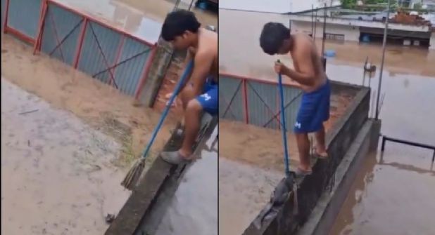 Desde lo alto de su casa, sus familiares grababan la escena, ya que la crecida del río había cubierto casi toda la comunidad. En las imágenes, de apenas 38 segundos de duración, el joven maniobra con cuidado para acercarse al animal y usa un trapeador como herramienta improvisada.