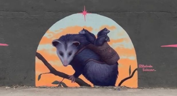San Nicolás de los Garza. – La artista Belinda Salazar creó un mural de una mamá tlacuache y sus crías en el municipio de San Nicolás de los Garza.