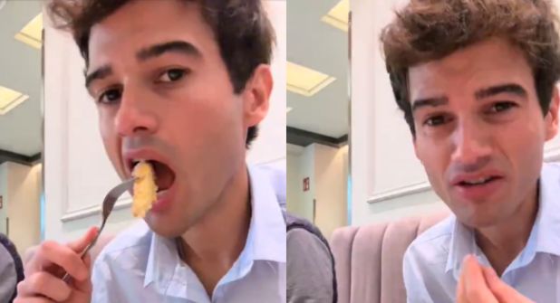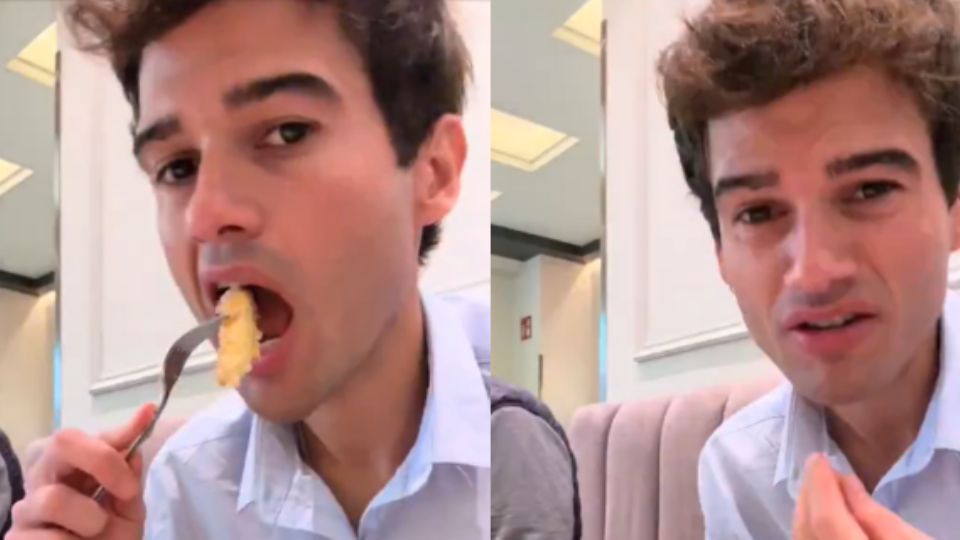 En el video, grabado en una cafetería de Madrid, el influencer observa el pan con curiosidad antes de probarlo.