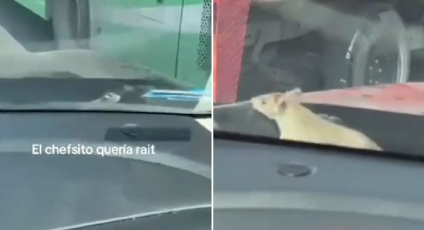 La rata no estuvo mucho tiempo ahí y continuó con su andar, no sin antes cruzar por el parabrisas de derecha a izquierda hasta finalmente irse.