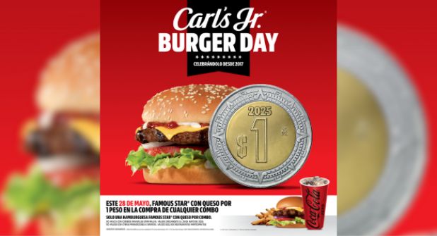Este martes 28 de mayo, Carl’s Jr. regalará su icónica hamburguesa Famous Star con queso por solo $1 peso al comprar cualquier combo en sus restaurantes.