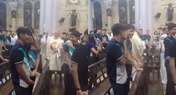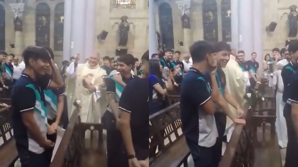El curioso hecho quedó captado en video por una de las asistentes y rápidamente se viralizó en TikTok. En las imágenes se observa el momento exacto en que el aspersorio cae sobre el estudiante durante el ritual religioso. Acto seguido, el monaguillo, visiblemente sorprendido, lleva sus manos a la cabeza en señal de incredulidad.