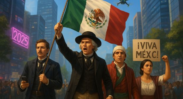 Sin embargo, elementos actuales como un dron sobrevolando y un cartel de neón con el año 2025 en el fondo señalan una protesta actual. La escena, llena de gente y encabezada por un grupo de líderes de época, simboliza cómo los ideales de libertad y soberanía de los próceres del siglo XIX se mantienen vivos y resuenan en las luchas sociales del México de hoy.