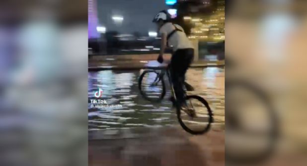 Monterrey.- Desde hace unos días en redes sociales como la plataforma TikTok se viralizó el video que muestra a un joven ciclista saltando al interior del canal del Paseo Santa Lucía en Monterrey.