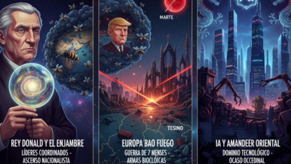 Una de las figuras centrales en las interpretaciones actuales es el llamado “Rey Donald”. Los analistas vinculan este apelativo con el retorno de agendas nacionalistas en Estados Unidos, simbolizadas en los textos por un “gran enjambre de abejas” que emerge de la oscuridad. Lejos de referirse a insectos, esta metáfora se lee hoy como una red de líderes poderosos actuando bajo una agenda coordinada que busca sacudir las estructuras tradicionales del poder.