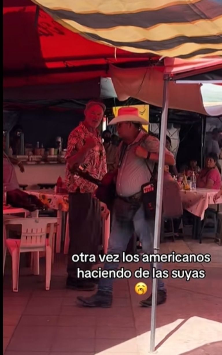 Sin embargo, el altercado ocurrió cuando un hombre presuntamente estadounidense se acercó al músico y comenzó a reclamarle en inglés que dejara de cantar e incluso se ve donde lo empuja y amenaza con golpearlo si seguía cantando.